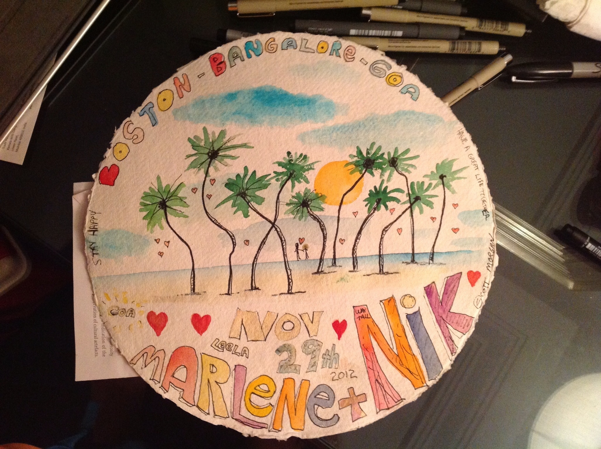 Today at 3:30 PM a beautiful young couple named Nik and Marlene are getting married at The Leela Hotel. This is the reason our new friend John from Boston is here. Scott and I have had fun playing ping pong with him and tonight we had dinner at Betty’s beach shack with John and four of his friends: Heather & Allan, Eamon & Annie. The latter couple attended UNH with John, the same college two of my own brothers went to (it’s a small world, isn’t it?) Scott did this watercolor as a gift for the bride and groom in record time after meeting the groom briefly while we were watching the sunset. 🙂