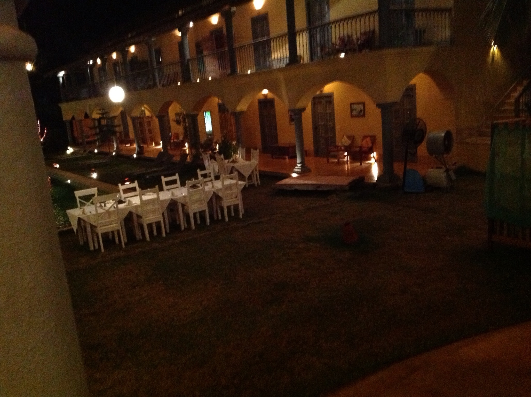 Most of the social interaction takes place at the outdoor bar where everyone gathers nightly –whether drinking or not– to rub elbows with the Resort’s owner and chief party goer. Our host, Aneel Verman , played a young freedom fighter in a hit Bollywood film back in 1971. We’ve seen the clip and he was quite good. His son has written and sung some original tunes that are really wonderful; I’ve been promised a copy of the as yet unpublished CD. We hear it played nightly on the stereo at full throttle. Last night there was a piano player and Scott, still in his bathrobe, sang his own made-up-on-the-spot version of a popular ballad and serenaded Aneel to wild applause from those gathered here. Somebody videotaped it and here it is on youtube!