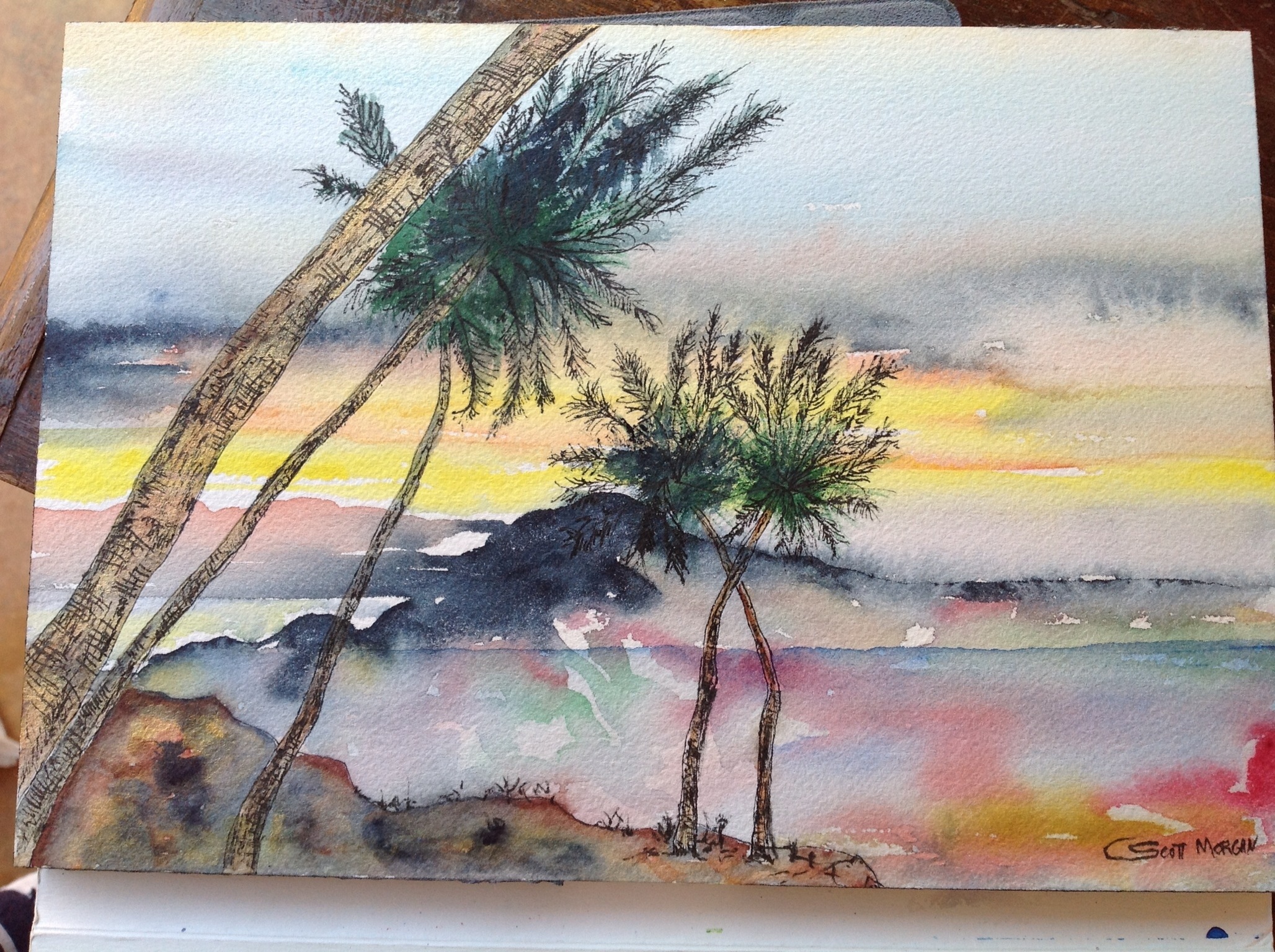 Scott has been painting a lot this weekend. Several paintings, two self portraits, and a miniature book of flower paintings. He’s also been manipulating his painted images digitally like the palm tree lanscape shown below. Which version do you prefer?