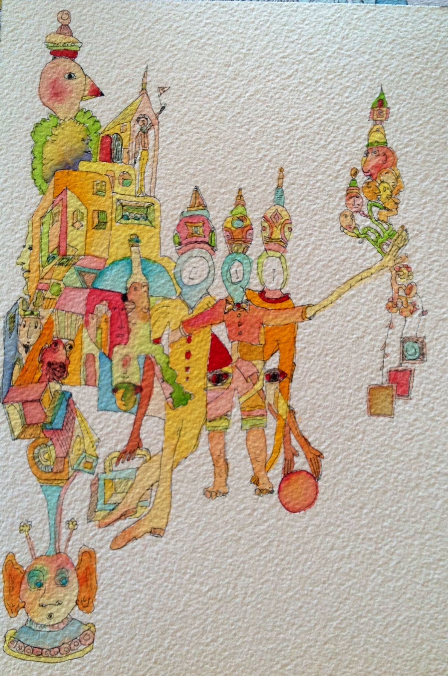 Wow…the more I look, the more faces emerge! Is that alien at bottom dreaming this up as it all appears to stream from his head? The figure on top of the bird. Is heScotton his piles of pillows? Or the Princess and the pea? Do I see three peas between those mattresses?