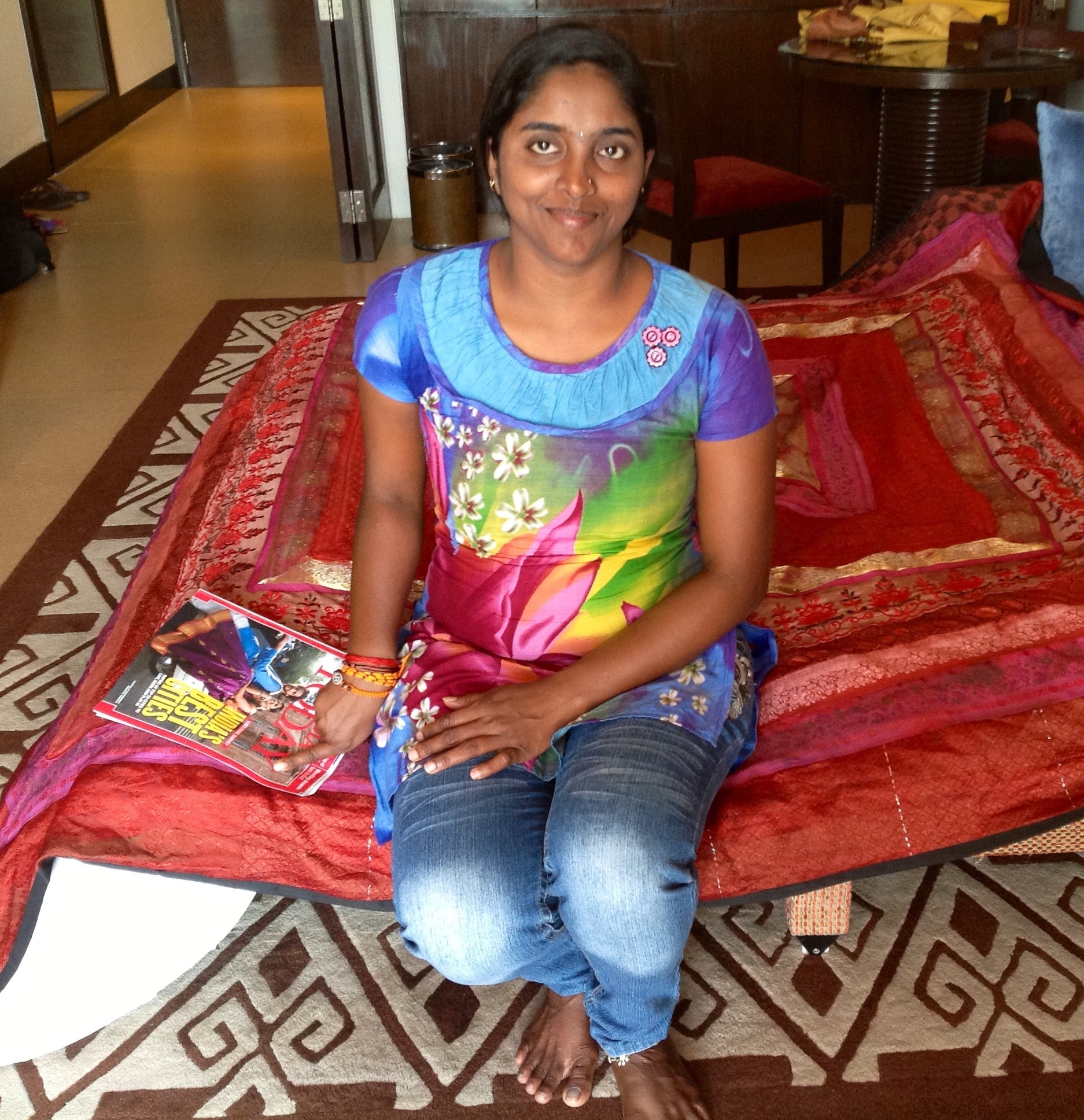 Lately Gang’s been intently observing Scott painting in the lobby cafe though I don’t know if she is absorbing any painting technique. Gang’s thing is hand crochet and I’ve seen her working quietly with yarn while I try to catch up on sleep. That’s my sofa bed Gang’s sitting on in the photo. Other days, like this one, while Gang’s on duty I’ve been out exploring Panaji shops. Or swimming. It was nearly 103 F yesterday and 98 F today as Goa is experiencing a heat wave without any cooling sea breezes. With the atmosphere so still and warm, even our Gang prefers to be inside chillin’.