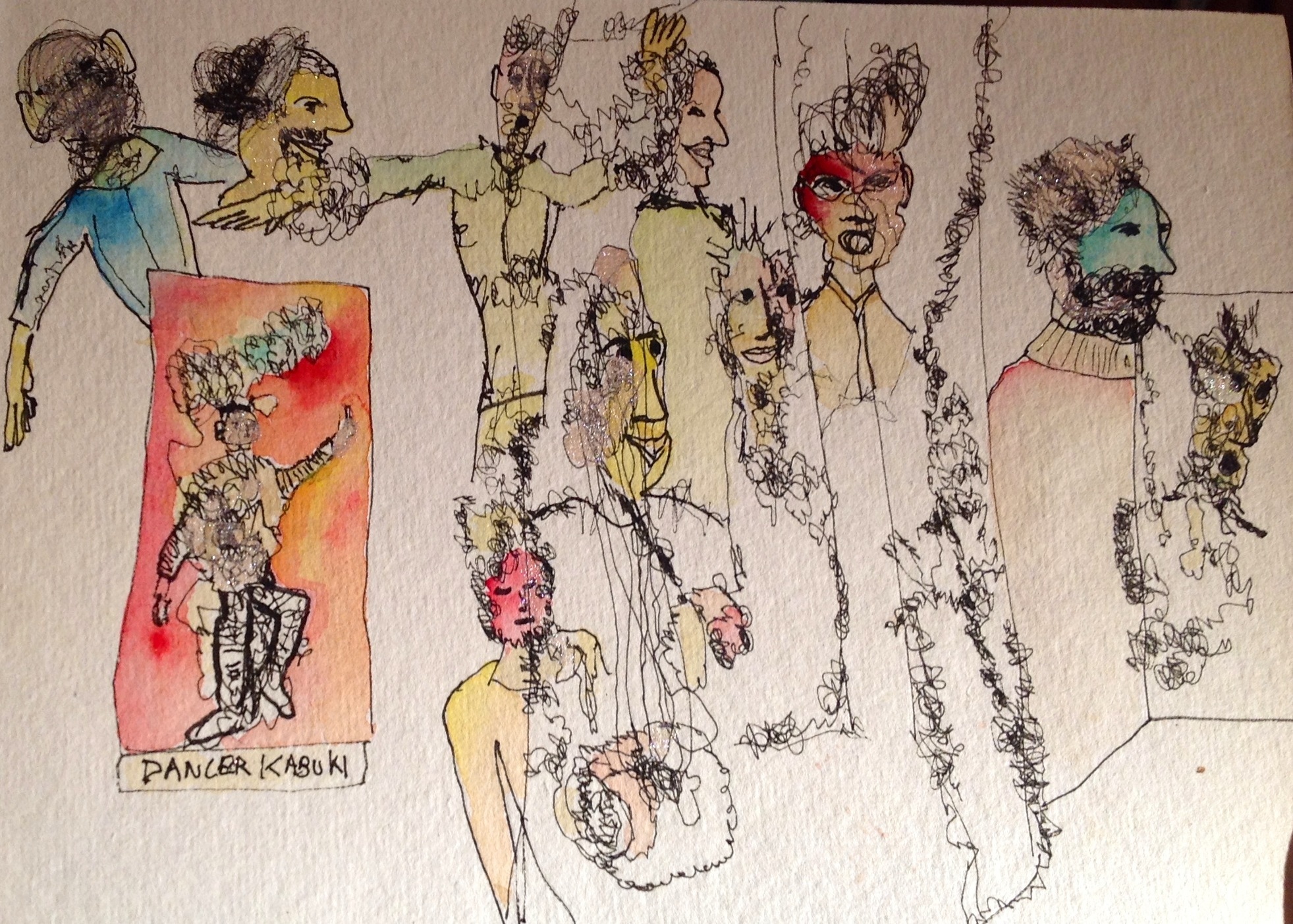 In the second one I love the combination of jiggles and spirits. The bear dudes are so adorable. Even the scary guys aren’t so much. And I enjoy seeing them look in all directions. You are leaving just enough open space for me to move comfortably about and visit each character in this one. The third painting I feel a bit claustrophobic, like at a cocktail party where I am looking for a tactful way to leave. You know I do not believe in good art and bad art. It all belongs even if I feel yucky about it. You are so amazing to me in the way you are allowing your life to fill pages and spill out to your friends. It feels very generous and loving.