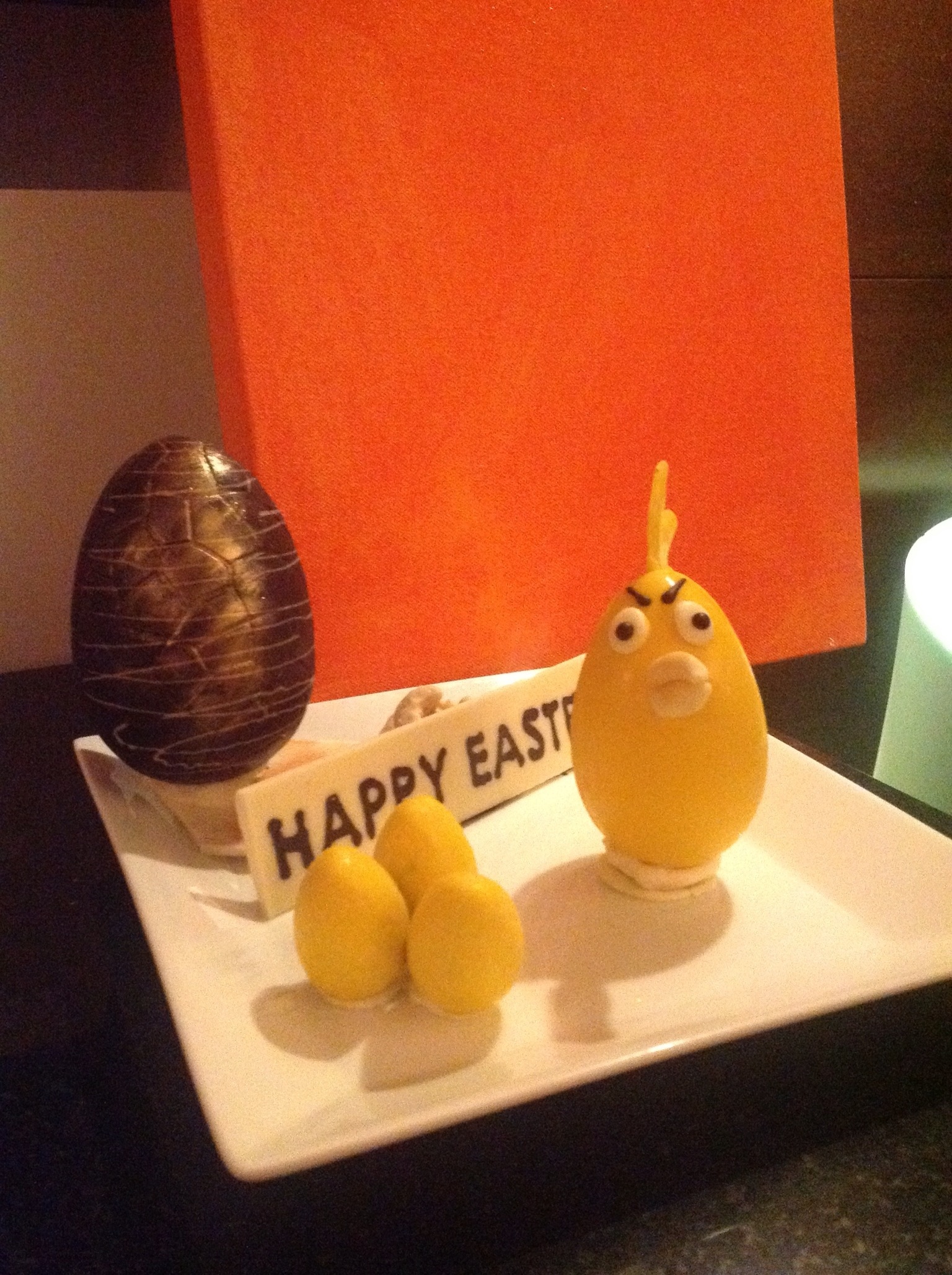 A little birdie must have whispered in Chef Samantha’s ear today that Scott was not feeling up to leaving the room to check out the Marriott easter brunch. She made this fabulous Angry Birds chocolate treat especially for us and had it delivered to our room by the easter bunny.