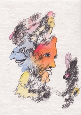 Above is Commode, the drawing underlay was done from his bed this weekend and his signature hues were applied this morning while sitting in the AzUR Cafe with his portable studio. The painting below was also a combination of black ink drawing done in bed with the paint applied this morning. However, the drawing was done in total darkness late at night like his Bitches Brew series.