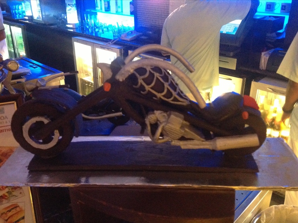 Then a couple days ago my road trip took me past the shop which is located near Dona Paula. Today I see the shop has already influenced the locals…this chocolate Harley chopper made by Chef Samantha Nunes was commissioned by a rider and is on display at Scott’s impromptu art studio, A.K.A.Cafe AzUR at our hotel. (Click the Cafe link to go back in time on this blog to enjoy some of the paintings Scott created there!).