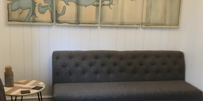 Ryan has retained the downeast island ambiance while totally transforming the space that has served at least 3 other restaurants before his. A four panel painting of mine, The Penobscot Expedition Map , adorns the lounge area wall. Three more Katy Allgeyer originals grace the venue. Acadia House Provisions’ lounge area is a cozy spot to sip a Grateful Dead-themed cocktail (turns out Ryan is a Dead Head) such as the China Cat Sunflower or the Casey Jones or the Friend of the Devil. I’ve dined inside and on the harbor deck and loved my experience at both. However, I must say I’m partial to the indoor seating where there are mojitos rather than mosquitos. And some mighty fine art on the walls… 🙂